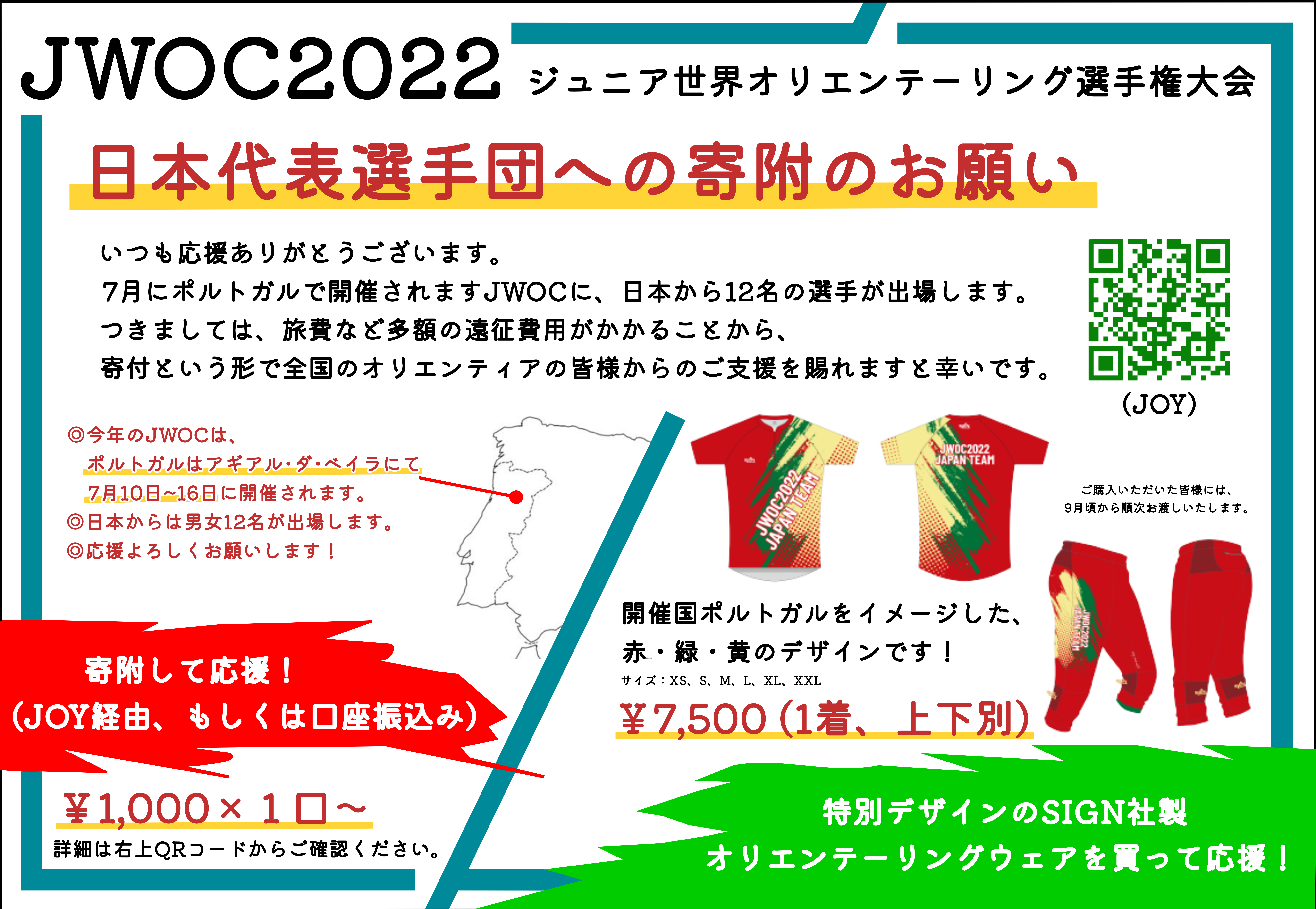 | いつも応援ありがとうございます。 7月にポルトガルで開催されますJWOC(ジュニア世界オリエンテーリング選手権大会)に、日本から12名の選手が出場します。つきましては、旅費など多額の遠征費用がかかることから、寄付という形で全国のオリエンティアの皆様からのご支援を賜れますと幸いです。 今年度はなんと!日本代表チーム特製のSIGN社製オリエンテーリングウェア(上下)を作製いたしました。例年Tシャツを購入していただいて売上の一部を遠征費用として活用しておりましたが、今年は本格的なオリエンテーリングウエアということで、是非この機会に上下セットでお買い求めください。 また、ウェアの購入を伴わないご寄付も受け付けています。 よろしくお願いいたします。 <オリジナルウェアについて> ・価格:上下それぞれ1着7500円です。(6/9追記:当初6500円としておりましたが、都合により値上げしました。既に申込みいただいていた方は当初の価格でご購入いただけます。) ・デザイン : 発行書類欄に掲載の「ポスター」をご参照ください。 ・サイズ : XS,S,M,L,XL,XXL <寄付金について> 以下の二つの方法で受け付けています。 ・JOY経由 ・強化委員会の口座へ直接振込み ゆうちょ銀行 ※口座へ直接振り込んでいただく場合には、JOYでの申込みは必要ありません。なお、ウェアの購入に関しては全てJOY経由での受付けとなっていますのでご注意ください。〇六八(ぜろろくはち)支店 普通口座 0139060 口座名 強化委員会(キョウカイインカイ) 連絡先:2022.jwoc.jpn @gmail.com |
