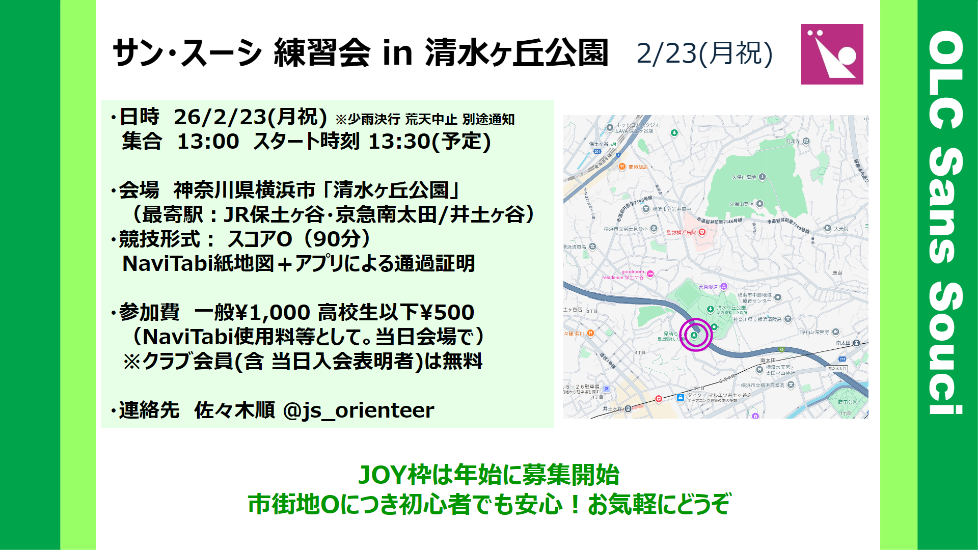 | さがみ野(25年4月)・岸根公園(25年7月)につづくスコアO練習会第3弾です。 13:00集合、13:30スタート、90分のスコアOです。 12/6 ページ新規作成 12/7 予告バナー掲載 12/28 要項公開(下記の通り) ■日時 2026年2月23日(月・祝) ※雨天時は延期なく中止(この場合、参加費はいただきません) ■会場 神奈川県横浜市「清水ヶ丘公園」 多目的広場付近 (最寄駅:JR保土ヶ谷、京急南太田・井土ヶ谷、市営地下鉄蒔田) ※主催者は特別に駐車場所を用意しません。 ※青空会場です。走れる格好での来場をお勧めします。(着替えが必要な方は公園内のトイレで)。 ■競技形式 ・スコアO(制限時間90分) ・地図はNaviTabiアプリの紙出力(国土地理院ベース、1:7500)を使用 ・スタートゴールは会場。 ・自動パンチ(スタート・フィニッシュのみ手動)、写真撮影不要。 ■エントリー ※1月上旬エントリ開始予定 Japan-O-entrY(JOY)よりお願いします。(締切2月16日、JOY枠先着10名) ※会場キャパの都合で参加者を制限しています。10名に達し次第締切。 ※サン・スーシ会員はここからはエントリしないでください。 ■参加費 一般 1,000円、高校生以下 500円 (地図印刷代、NaviTabiアプリの出走料、ライセンス料に充当) ※サン・スーシ会員(含 当日入会表明者)は無料。 ■タイムスケジュール(目安) 13:00~13:30 会場受付 13:30 スタート地点集合、競技説明 競技説明終了次第、各自でスタート可 16:00 会場撤収、希望者は打ち上げに(?) ■お知らせ 練習会終了後、本コースは無料で開放します。 ただし、紙地図を持って走るにはNaviTabiプレイヤープラン(1200円/年など)への加入が必要です。 ■連絡先 佐々木 順(OLCサン・スーシ) E-Mail: jsasaki(at)ymail.ne.jp |